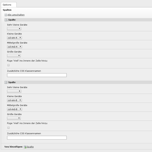 Bootstrap 4 kommt mit einem komplexen Grid-System, um Elemente in den verschiedenen Ansichten optimal positionieren zu können. Im Backend stehen dem Redakteur bei den Grid-Elementen verschiedene Auswahlmöglichkeiten je nach Ansicht (Smartphone, Tablet, Desktop, Großer Bildschirm) zur Verfügung.